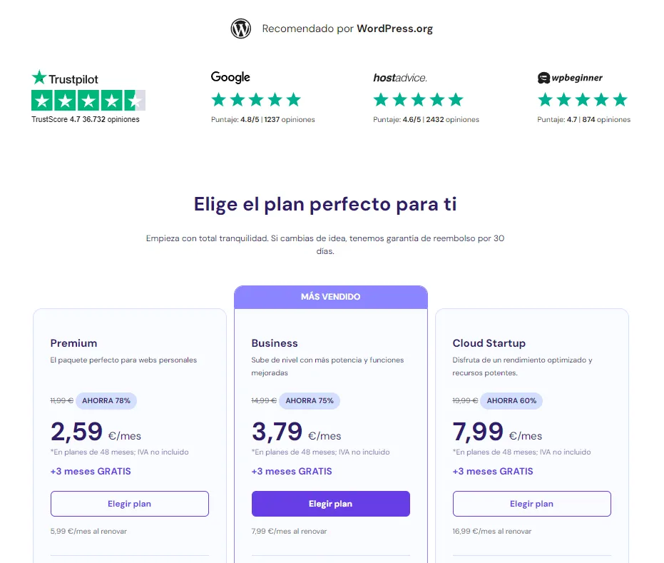 Hostinger ofrece planes de alojamiento específicos para WordPress que incluyen instalación con un solo clic, certificación SSL gratuita y soporte técnico 24/7. Esto es especialmente útil si, como yo, no eres una experta técnica y necesitas una plataforma que haga las cosas lo más sencillas posible. Además, los precios de Hostinger son muy competitivos, lo que lo convierte en una opción ideal para quienes están comenzando.