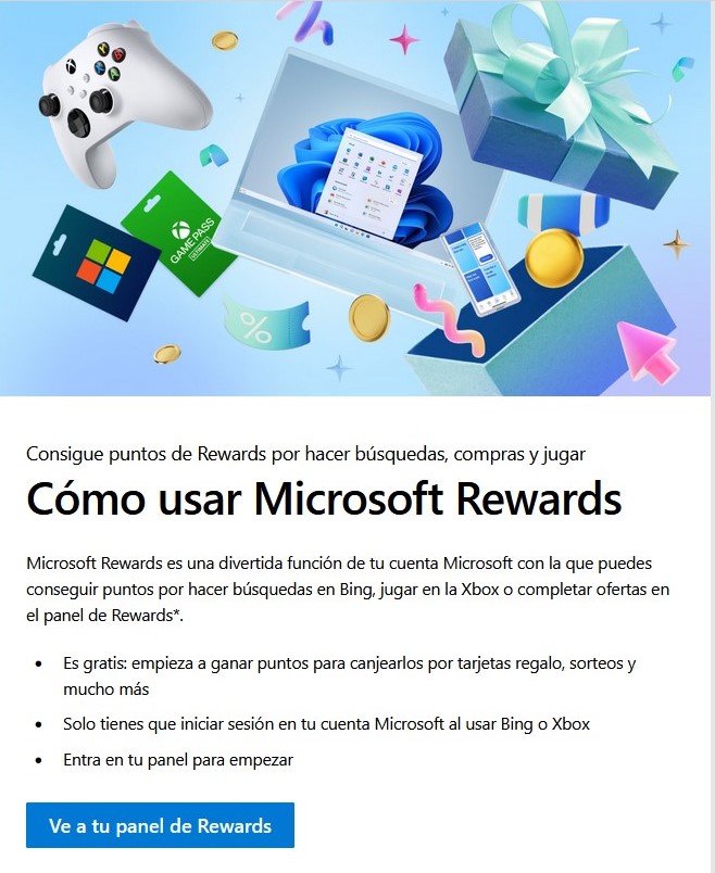 Microsoft Rewards es un programa gratuito de fidelización creado por Microsoft que te permite ganar puntos realizando actividades simples como: