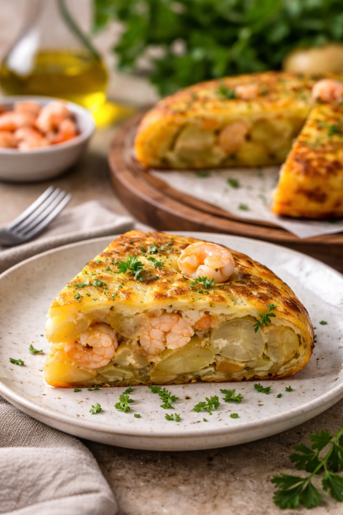 Si te gusta la tortilla de papas, agregarle gambas es una manera fácil de darle un toque especial sin complicarte demasiado en la cocina. La suavidad de la papa junto con el sabor delicado de las gambas crea un contraste delicioso.